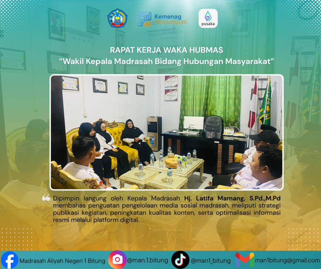 Bitung — MAN 1 Bitung melaksanakan Rapat Kerja Wakil Kepala Madrasah Bidang Hubungan Masyarakat (Waka Humas) sebagai upaya memperkuat peran humas dalam menyampaikan informasi kepada masyarakat melalui media sosial.